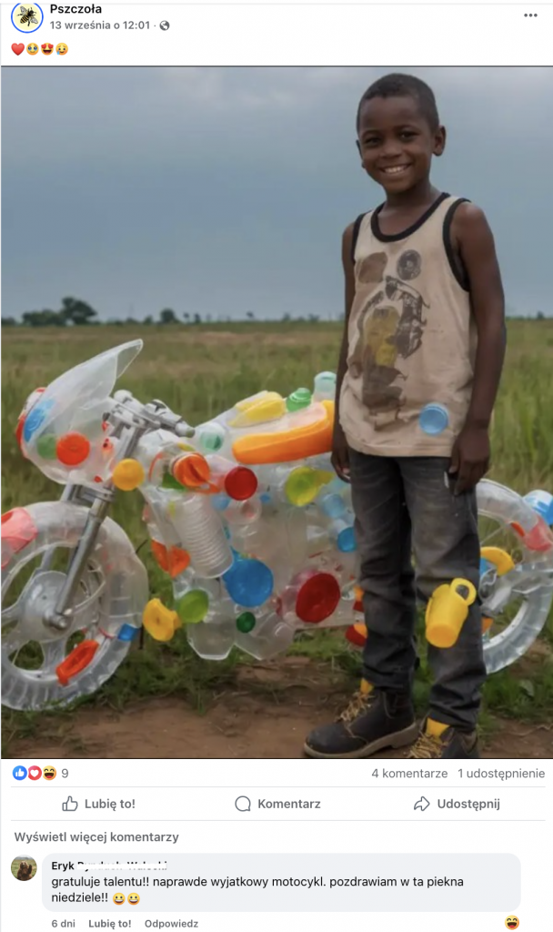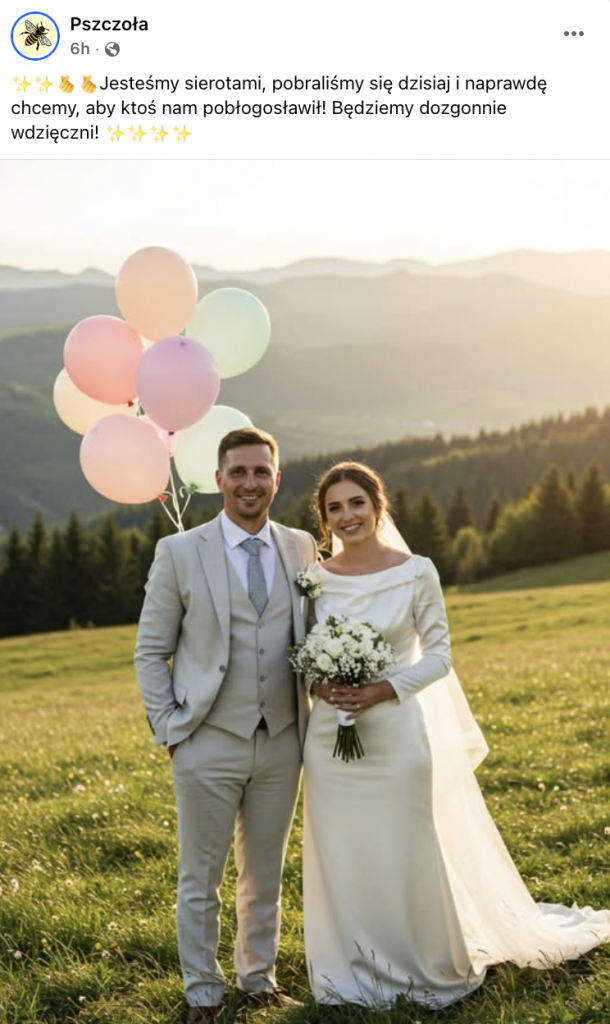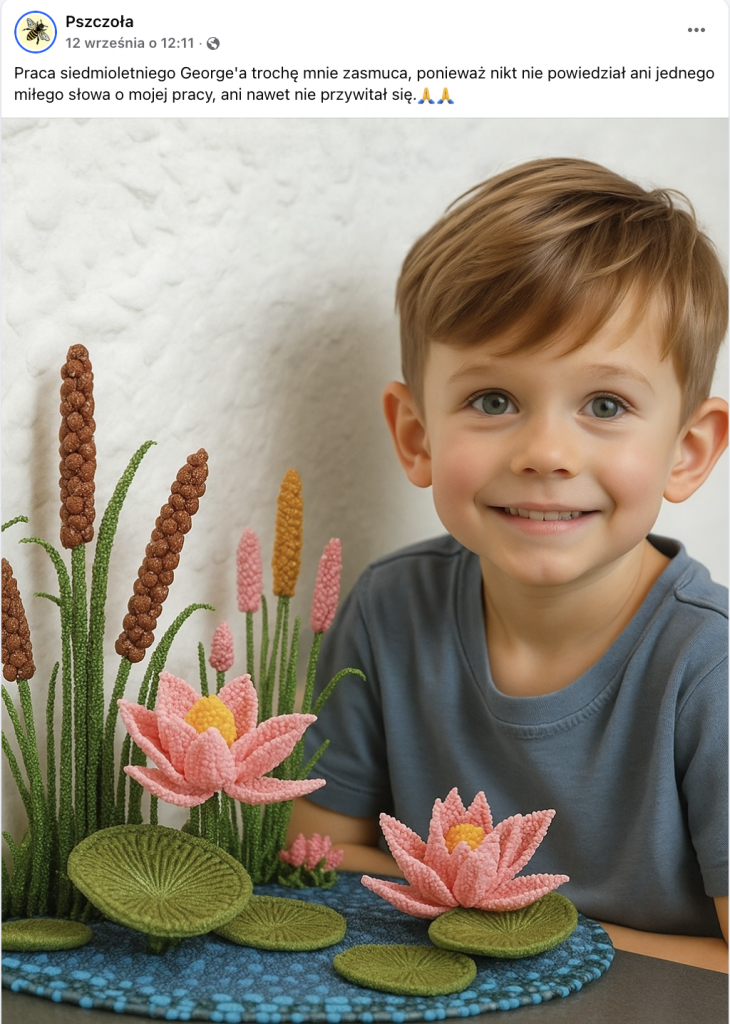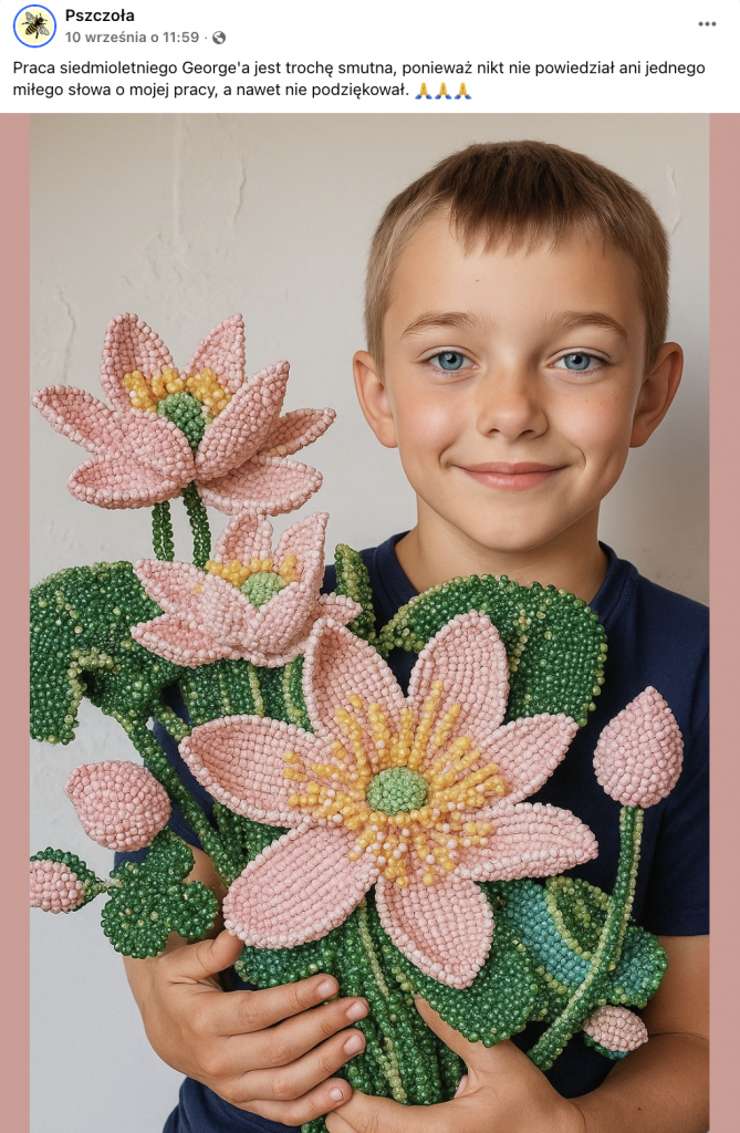 This phenomenon of a weirdly looking collage has grown so popular that it eventually transformed into a medium for scamming older people with the use of AI generated content. Because they were already so used to those distorted quality images on the platform, the AI images seemed just as normal. This content is usually posted Facebook groups called with a single verb name, luring people to believe that they are joining a group concentrated on a specific content, for example an animal like “Pszczoła” – a bee, though they do not have anything in common with the posts on that group. All these posts are a combination of a fake picture and its short description, usually emotional and encouraging to leave a comment. Often these descriptions have grammatical or spelling mistakes which should be easier to detect and may leave an additional cue of the posts being fake, even for wider audiences who not necessarily are familiar with modern visual media technologies.