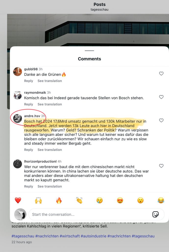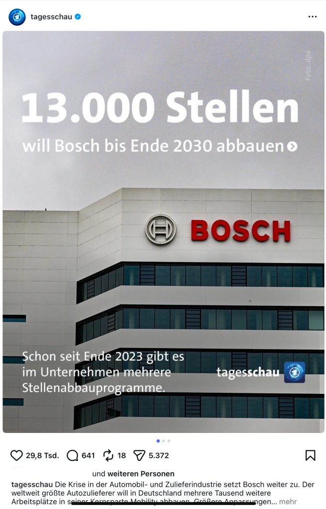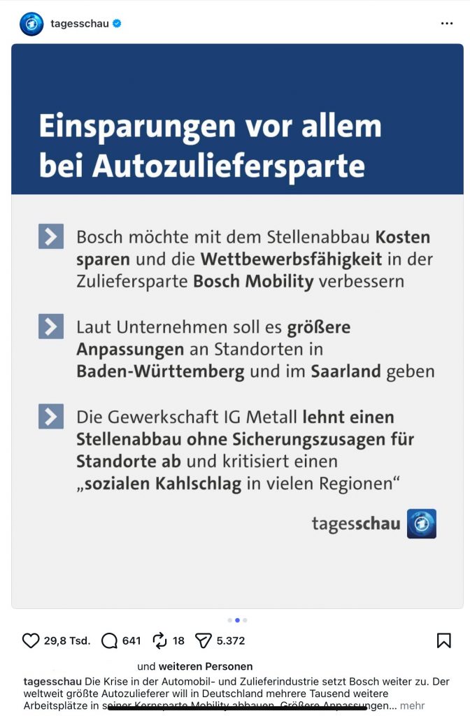 Correspondently, the public service news channel Die Tagesschau published a three slide post on Instagram with the heading “Bosch plans to cut 13.000 jobs by the end of 2030” on the same day.