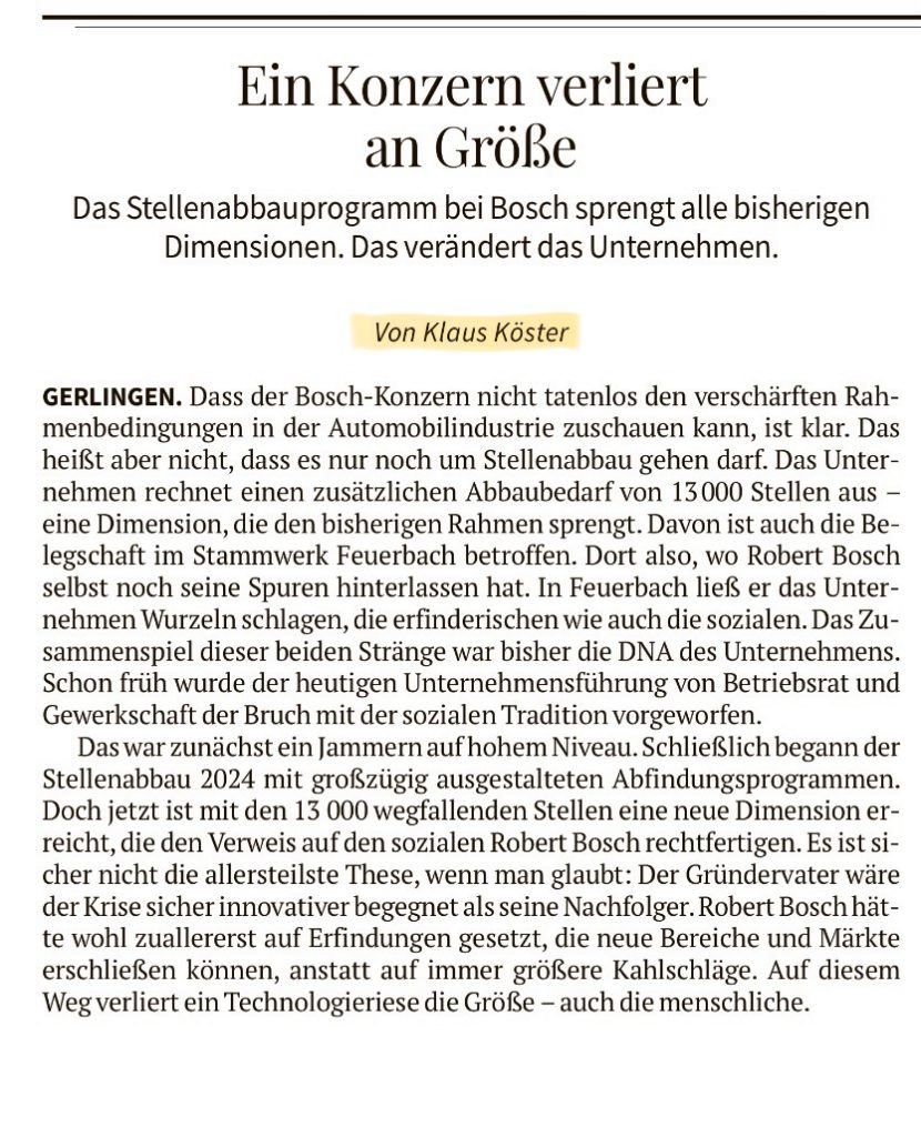 The headline of the (by me digitally consulted) German Newspaper Stuttgarter Zeitung on Friday, September 26 (2025), was the following: “Drastic job cuts at Bosch”. (Bosch is one of Germany’s largest technology companies, particularly in the automotive supply sector, and a major employer.)