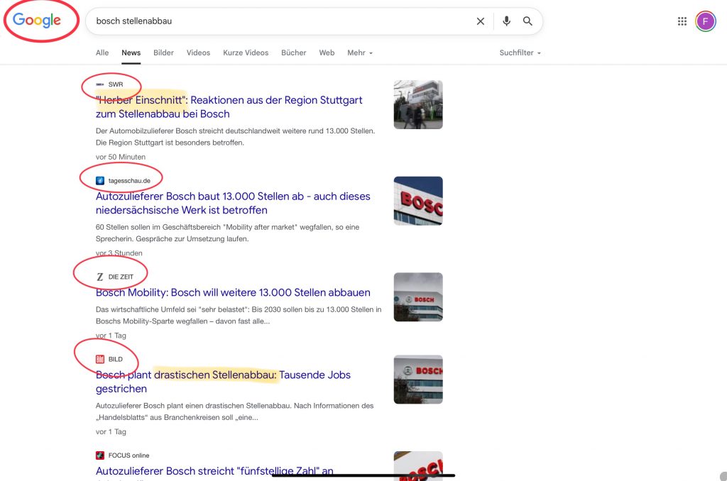 Logically, the next step in finding out more about the issue would still be an online search. Without surprise, typing in “Bosch” in my search engine, “job cuts” is directly the first search suggestion. (Here it might be interesting to be using a browser that’s default setting is not German language, for it is clear that the suggestions and results would be different.)