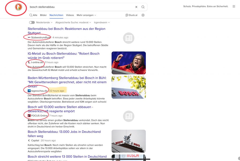 If one searches up “Bosch job cuts”, so the exact same term, in the browser “DuckDuckGo”, the first 4 news results are similar, however not identical: the Tagesschau appears again, however with a different, slightly older article, the Bild article doesn’t show up at all and instead two online magazines.