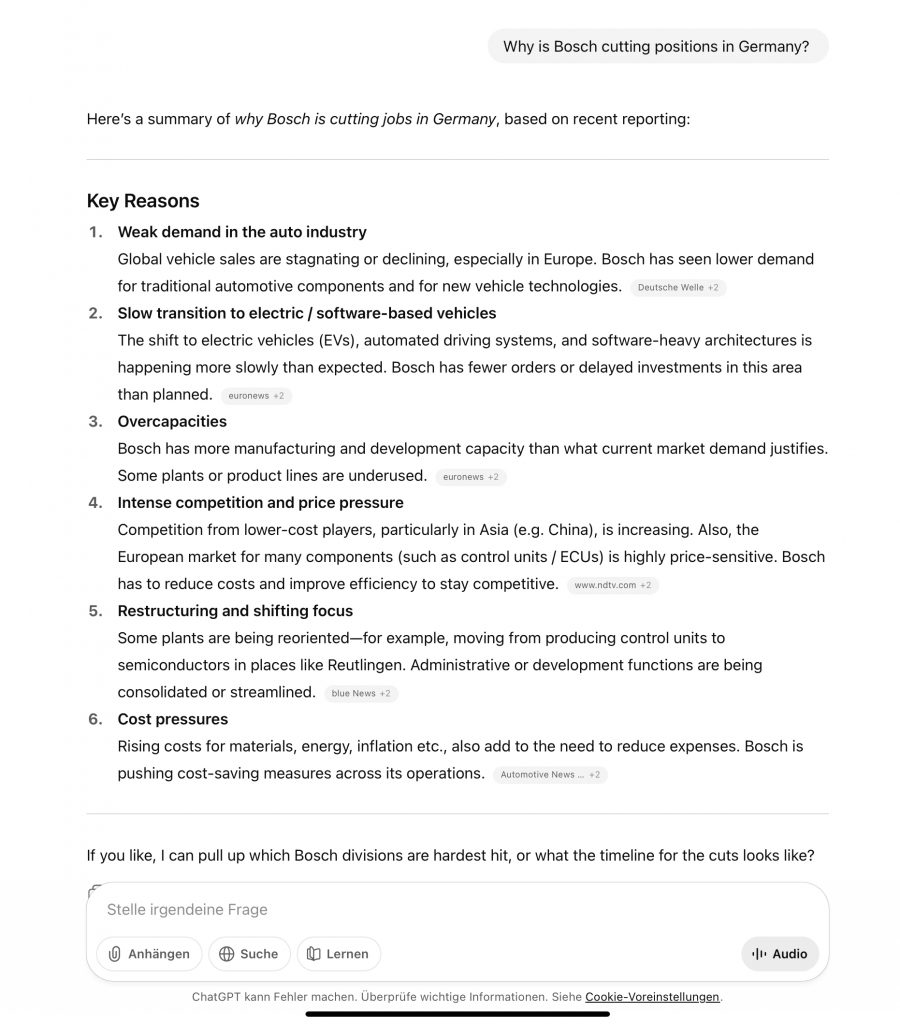 A similar effect has the further search of the topic in artificial intelligence engines: asking both ChatGPT and perplexity the same question, “Why is Bosch cutting positions in Germany?”, leads to very different answers, also depending upon which language (German or English) I use for the prompt. Again, the content might not differ – and admittedly, I choose a topical issue that comes with factual information and little controversy on purpose – but the way the content is listed, phrased and backed up. Both ChatGPT and perplexity address and even directly link their sources, but they are again very different. Perplexity for example uses the official press release from Bosch as their first source, which isn’t mentioned at all by ChatGPT.