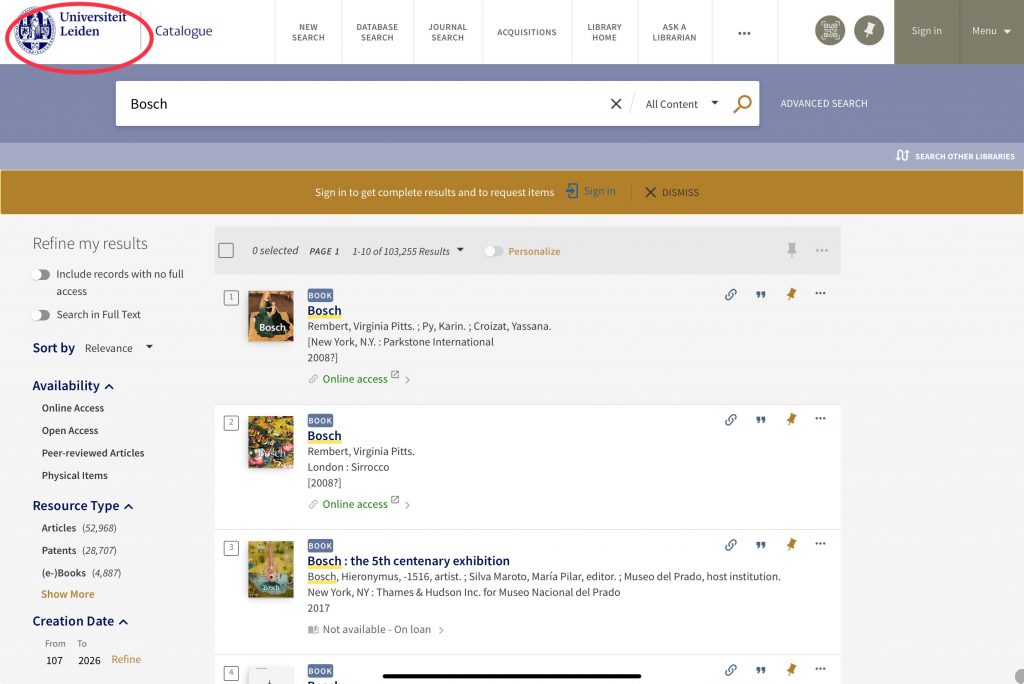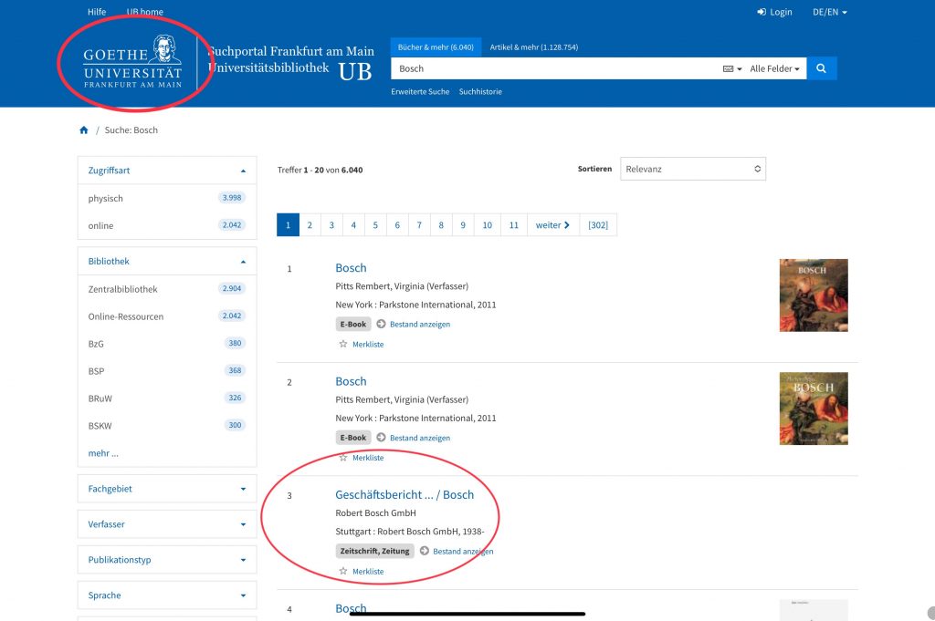Another interesting example is looking up “Bosch” in academic library catalogues – which has been taught to us at University as the reliable source. And again, depending on which one I use, Leiden’s library or the catalogue of the German Goethe University in Frankfurt, the top results of Leiden all refer to the artist Hieronymus Bosch, while the third result of Frankfurt is the annual business report of Bosch (the company).