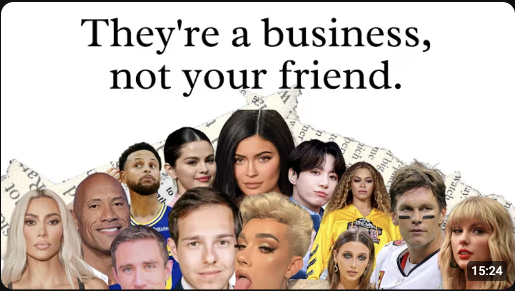 This reminded me of a video I watched a while ago, titled “Influencers Don’t Care If You Go Broke” by Cara Nicole. It basically talks about how influencers create an emotional bond with their followers, even though they don’t actually know them. When you follow someone for a long time, you see their face every day, you listen to their stories, their routines, their emotions, it starts to feel like you know them personally and like you could trust them. So when they recommend something or promote a brand, it ends up not feeling like an ad anymore and instead like a friend giving you advice.