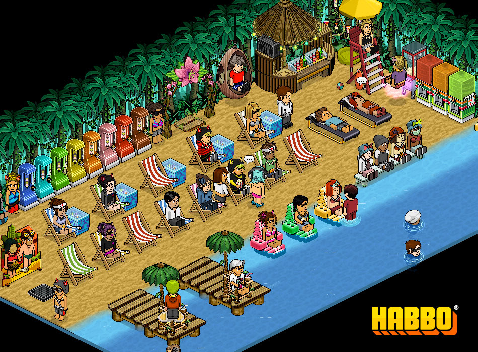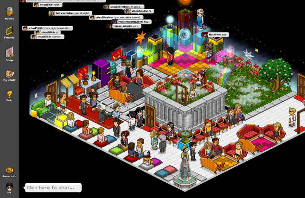 Habbo Hotel was an online game where you could customize your avatar, decorate virtual rooms and communicate with other players. You needed coins to buy furniture and make the rooms. Then you could put your room online and anybody could join and check the room out. Users were really creative with their rooms, creating themes and stories around them.